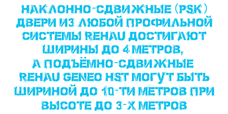 Наклонно-сдвижные (PSK) двери из любой профильной системы REHAU достигают ширины до 4 метров, а подъёмно-сдвижные REHAU GENEO HST могут быть шириной до 10-ти метров при высоте до 3-х метров.