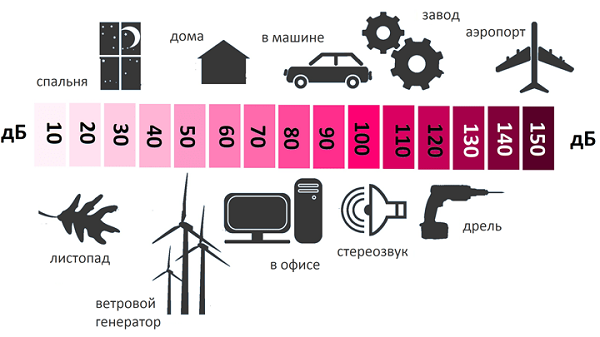 Фото: уровень шума в различных помещениях и от различных источниковПовысить звукоизоляционные свойства окон можно используя многослойные стёкла (триплекс) в стеклопакетах. При постоянно повышенном уровне шума (рядом оживленная автострада или аэропорт) рекомендуется специальный акустический триплекс со слоем специальной плёнки между стёклами.