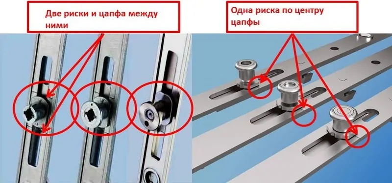 Фото: положение запорных цапф определяется по меткам (рискам) на фурнитуре, © RotoЕсли рисок две – цапфа должна находиться посередине между ними. Если риска одна, она должна приходиться точно по центру цапфы.