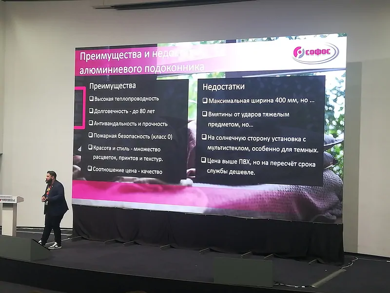 Анатолий Сорокин, Софос, рассказал об эксклюзивном продукте компании – алюминиевом подоконнике Алюмсил в докладе – Зона отдыха, рабочее пространство у окна, возможность отопление с помощью алюминиевого подоконника и новых возможностях использования подоконника.