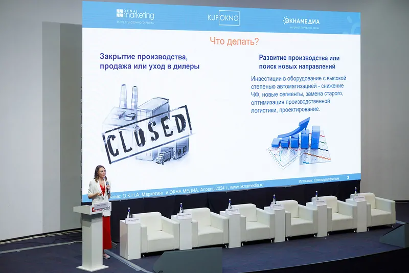 Обросова Ирина, О.К.Н.А. Маркетинг и КУПИОКНО, в начале 3й сессии представила доклад "Ситуация с оборудованием в условиях санкций. Возможности развития перспективных направлений на рынке остекления".