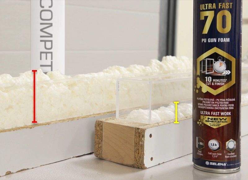 Фото: сравнение уровня (высоты) вторичного расширения у обычной монтажной пены (красный столбик) и профессиональной TYTAN Professional Ultra Fast 70 (желтый столбик)