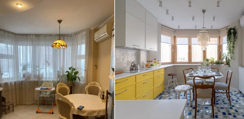 До переделки на кухне было стандартное остекление: белые «пластиковые прямоугольники». Дизайнер Наталия Прозорова изменила привычный подход устройству пространства: акриловая столешница плавно перешла в подоконник и соединила окно с кухонным гарнитуром. Остекление поддержало задумку дизайнера.
