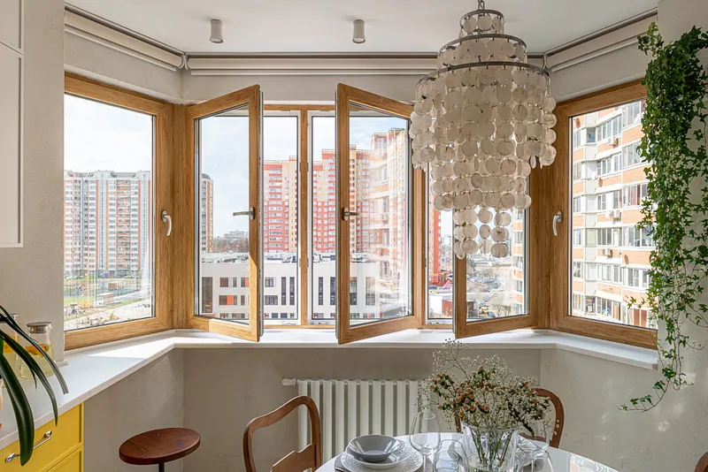 Компания «Остров Окон» заменила старое эркерное окно. Новое c ламинацией профиля цвета «песочный дуб», ручками и фурнитурой SIEGENIA TITAN AF axxent 24+ стало частью общей концепции кухни. Дизайнер проекта пояснила: ламинация под натуральное дерево обогащает интерьер дополнительной текстурой. Петли системы TITAN AF axxent 24+ скрыты и не нарушают дизайн профиля видимыми элементами. Серебристые ручки Globe сочетаются с фурнитурой кухонного гарнитура.
