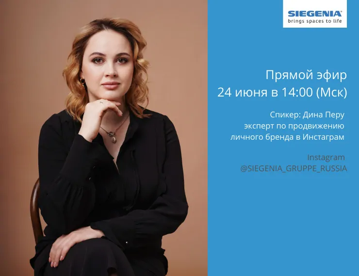 24 июня в 14:00 (Мск) в Инстаграм Ольга Иванова, директор по маркетингу SIEGENIA, проведёт прямой эфир с Диной Перу, экспертом по продвижению личного бренда в Инстаграм. Тема встречи: «Пошаговый план продающего аккаунта в Инстаграм». Рассказываем, чем эфир будет полезен специалистам оконного рынка.